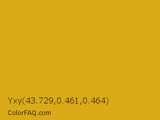 Yxy 43.729,0.461,0.464 Color is a normal orange color and the nearest color is Golden Grass #daa520. Hex code #daaa19 and RGB value is rgb(218,170,25). In RGB color space, this color is composed of 85% red, 67% green, 10% blue, In CMYK color space, this color is composed of 0% cyan, 22% magenta, 89% yellow , 15% black , In HSL color space, this color has a hue angle of 45° , 79% saturation and 48% lightness.