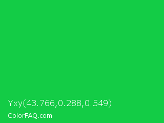 Yxy 43.766,0.288,0.549 Color is a normal green color and the nearest color is Malachite #0bda51. Hex code #13cc46 and RGB value is rgb(19,204,70). In RGB color space, this color is composed of 7% red, 80% green, 27% blue, In CMYK color space, this color is composed of 91% cyan, 0% magenta, 66% yellow , 20% black , In HSL color space, this color has a hue angle of 137° , 83% saturation and 44% lightness.