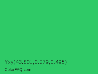 Yxy 43.801,0.279,0.495 Color is a normal green color and the nearest color is UFO Green #3cd070. Hex code #2eca67 and RGB value is rgb(46,202,103). In RGB color space, this color is composed of 18% red, 79% green, 40% blue, In CMYK color space, this color is composed of 77% cyan, 0% magenta, 49% yellow , 21% black , In HSL color space, this color has a hue angle of 142° , 63% saturation and 49% lightness.