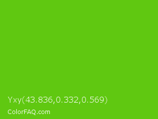 Yxy 43.836,0.332,0.569 Color is a normal green color and the nearest color is Kelly Green #4cbb17. Hex code #60c811 and RGB value is rgb(96,200,17). In RGB color space, this color is composed of 38% red, 78% green, 7% blue, In CMYK color space, this color is composed of 52% cyan, 0% magenta, 92% yellow , 22% black , In HSL color space, this color has a hue angle of 94° , 84% saturation and 43% lightness.