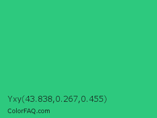 Yxy 43.838,0.267,0.455 Color is a normal green color and the nearest color is UFO Green #3cd070. Hex code #2dc97e and RGB value is rgb(45,201,126). In RGB color space, this color is composed of 18% red, 79% green, 49% blue, In CMYK color space, this color is composed of 78% cyan, 0% magenta, 37% yellow , 21% black , In HSL color space, this color has a hue angle of 151° , 63% saturation and 48% lightness.