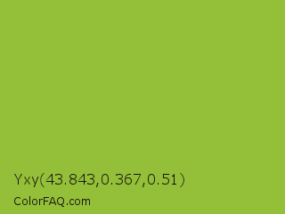 Yxy 43.843,0.367,0.51 Color is a normal lime color and the nearest color is Yellow Green #9acd32. Hex code #94bf38 and RGB value is rgb(148,191,56). In RGB color space, this color is composed of 58% red, 75% green, 22% blue, In CMYK color space, this color is composed of 23% cyan, 0% magenta, 71% yellow , 25% black , In HSL color space, this color has a hue angle of 79° , 55% saturation and 48% lightness.