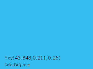Yxy 43.848,0.211,0.26 Color is a normal blue color and the nearest color is Picton Blue #45b1e8. Hex code #34bef0 and RGB value is rgb(52,190,240). In RGB color space, this color is composed of 20% red, 75% green, 94% blue, In CMYK color space, this color is composed of 78% cyan, 21% magenta, 0% yellow , 6% black , In HSL color space, this color has a hue angle of 196° , 86% saturation and 57% lightness.