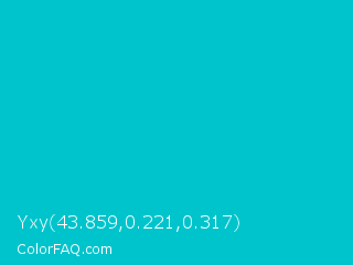 Yxy 43.859,0.221,0.317 Color is a normal cyan color and the nearest color is Turquoise Surf #00c5cd. Hex code #00c4cc and RGB value is rgb(0,196,204). In RGB color space, this color is composed of 0% red, 77% green, 80% blue, In CMYK color space, this color is composed of 100% cyan, 4% magenta, 0% yellow , 20% black , In HSL color space, this color has a hue angle of 182° , 100% saturation and 40% lightness.