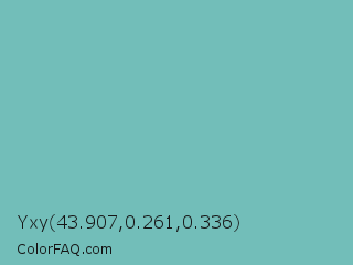 Yxy 43.907,0.261,0.336 Color is a normal cyan color and the nearest color is Neptune #7cb7bb. Hex code #72beb9 and RGB value is rgb(114,190,185). In RGB color space, this color is composed of 45% red, 75% green, 73% blue, In CMYK color space, this color is composed of 40% cyan, 0% magenta, 3% yellow , 25% black , In HSL color space, this color has a hue angle of 176° , 37% saturation and 60% lightness.