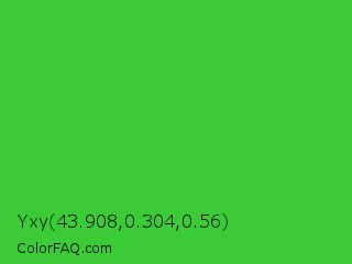 Yxy 43.908,0.304,0.56 Color is a normal green color and the nearest color is Lime Green #32cd32. Hex code #3bcb36 and RGB value is rgb(59,203,54). In RGB color space, this color is composed of 23% red, 80% green, 21% blue, In CMYK color space, this color is composed of 71% cyan, 0% magenta, 73% yellow , 20% black , In HSL color space, this color has a hue angle of 118° , 59% saturation and 50% lightness.
