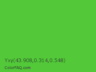Yxy 43.908,0.314,0.548 Color is a normal green color and the nearest color is Green RYB #66b032. Hex code #52c939 and RGB value is rgb(82,201,57). In RGB color space, this color is composed of 32% red, 79% green, 22% blue, In CMYK color space, this color is composed of 59% cyan, 0% magenta, 72% yellow , 21% black , In HSL color space, this color has a hue angle of 110° , 57% saturation and 51% lightness.