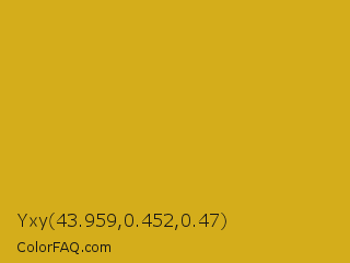 Yxy 43.959,0.452,0.47 Color is a normal yellow color and the nearest color is Golden Grass #daa520. Hex code #d4ad1b and RGB value is rgb(212,173,27). In RGB color space, this color is composed of 83% red, 68% green, 11% blue, In CMYK color space, this color is composed of 0% cyan, 18% magenta, 87% yellow , 17% black , In HSL color space, this color has a hue angle of 47° , 77% saturation and 47% lightness.