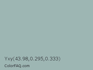 Yxy 43.98,0.295,0.333 Color is a light cyan color and the nearest color is Hit Gray #a1adb5. Hex code #9eb6b3 and RGB value is rgb(158,182,179). In RGB color space, this color is composed of 62% red, 71% green, 70% blue, In CMYK color space, this color is composed of 13% cyan, 0% magenta, 2% yellow , 29% black , In HSL color space, this color has a hue angle of 173° , 14% saturation and 67% lightness.