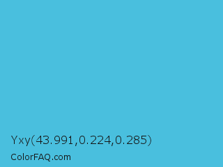 Yxy 43.991,0.224,0.285 Color is a normal cyan color and the nearest color is Sea Serpent #4bc7cf. Hex code #49bfde and RGB value is rgb(73,191,222). In RGB color space, this color is composed of 29% red, 75% green, 87% blue, In CMYK color space, this color is composed of 67% cyan, 14% magenta, 0% yellow , 13% black , In HSL color space, this color has a hue angle of 192° , 69% saturation and 58% lightness.