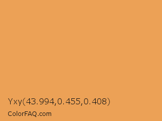 Yxy 43.994,0.455,0.408 Color is a light orange color and the nearest color is Indian Yellow #e3a857. Hex code #eca156 and RGB value is rgb(236,161,86). In RGB color space, this color is composed of 93% red, 63% green, 34% blue, In CMYK color space, this color is composed of 0% cyan, 32% magenta, 64% yellow , 7% black , In HSL color space, this color has a hue angle of 30° , 80% saturation and 63% lightness.