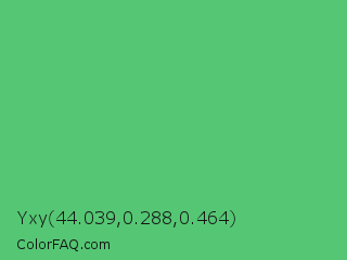 Yxy 44.039,0.288,0.464 Color is a normal green color and the nearest color is Emerald #50c878. Hex code #55c774 and RGB value is rgb(85,199,116). In RGB color space, this color is composed of 33% red, 78% green, 45% blue, In CMYK color space, this color is composed of 57% cyan, 0% magenta, 42% yellow , 22% black , In HSL color space, this color has a hue angle of 136° , 50% saturation and 56% lightness.
