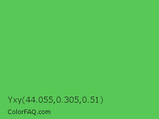 Yxy 44.055,0.305,0.51 Color is a normal green color and the nearest color is Fern #63b76c. Hex code #58c856 and RGB value is rgb(88,200,86). In RGB color space, this color is composed of 35% red, 78% green, 34% blue, In CMYK color space, this color is composed of 56% cyan, 0% magenta, 57% yellow , 22% black , In HSL color space, this color has a hue angle of 119° , 51% saturation and 56% lightness.