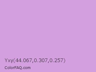 Yxy 44.067,0.307,0.257 Color is a light purple color and the nearest color is Tropical Violet #cda4de. Hex code #d49fde and RGB value is rgb(212,159,222). In RGB color space, this color is composed of 83% red, 62% green, 87% blue, In CMYK color space, this color is composed of 5% cyan, 28% magenta, 0% yellow , 13% black , In HSL color space, this color has a hue angle of 290° , 49% saturation and 75% lightness.