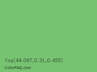 Yxy 44.097,0.31,0.455 Color is a light green color and the nearest color is Iguana Green #71bc78. Hex code #76c372 and RGB value is rgb(118,195,114). In RGB color space, this color is composed of 46% red, 76% green, 45% blue, In CMYK color space, this color is composed of 39% cyan, 0% magenta, 42% yellow , 24% black , In HSL color space, this color has a hue angle of 117° , 40% saturation and 61% lightness.