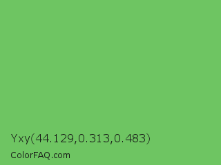 Yxy 44.129,0.313,0.483 Color is a normal green color and the nearest color is Mantis #74c365. Hex code #6ec562 and RGB value is rgb(110,197,98). In RGB color space, this color is composed of 43% red, 77% green, 38% blue, In CMYK color space, this color is composed of 44% cyan, 0% magenta, 50% yellow , 23% black , In HSL color space, this color has a hue angle of 113° , 46% saturation and 58% lightness.