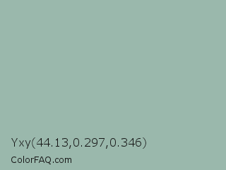 Yxy 44.13,0.297,0.346 Color is a light green color and the nearest color is Summer Green #96bbab. Hex code #9ab8ac and RGB value is rgb(154,184,172). In RGB color space, this color is composed of 60% red, 72% green, 67% blue, In CMYK color space, this color is composed of 16% cyan, 0% magenta, 7% yellow , 28% black , In HSL color space, this color has a hue angle of 156° , 17% saturation and 66% lightness.
