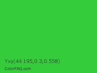 Yxy 44.195,0.3,0.558 Color is a normal green color and the nearest color is Lime Green #32cd32. Hex code #34cc3a and RGB value is rgb(52,204,58). In RGB color space, this color is composed of 20% red, 80% green, 23% blue, In CMYK color space, this color is composed of 75% cyan, 0% magenta, 72% yellow , 20% black , In HSL color space, this color has a hue angle of 122° , 60% saturation and 50% lightness.