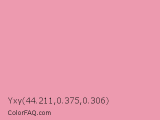 Yxy 44.211,0.375,0.306 Color is a light red color and the nearest color is Mauvelous #ef98aa. Hex code #ed9aaf and RGB value is rgb(237,154,175). In RGB color space, this color is composed of 93% red, 60% green, 69% blue, In CMYK color space, this color is composed of 0% cyan, 35% magenta, 26% yellow , 7% black , In HSL color space, this color has a hue angle of 345° , 70% saturation and 77% lightness.
