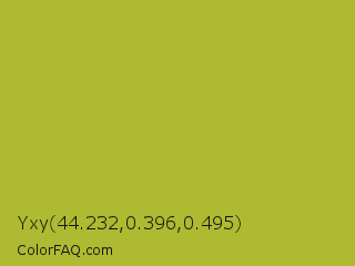 Yxy 44.232,0.396,0.495 Color is a normal yellow color and the nearest color is Android Green #a4c639. Hex code #adba32 and RGB value is rgb(173,186,50). In RGB color space, this color is composed of 68% red, 73% green, 20% blue, In CMYK color space, this color is composed of 7% cyan, 0% magenta, 73% yellow , 27% black , In HSL color space, this color has a hue angle of 66° , 58% saturation and 46% lightness.