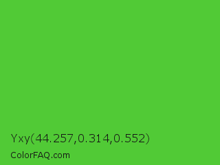 Yxy 44.257,0.314,0.552 Color is a normal green color and the nearest color is Lime Green #32cd32. Hex code #51ca36 and RGB value is rgb(81,202,54). In RGB color space, this color is composed of 32% red, 79% green, 21% blue, In CMYK color space, this color is composed of 60% cyan, 0% magenta, 73% yellow , 21% black , In HSL color space, this color has a hue angle of 109° , 58% saturation and 50% lightness.
