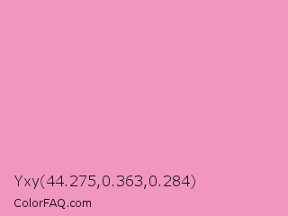 Yxy 44.275,0.363,0.284 Color is a light rose color and the nearest color is Pastel Magenta #f49ac2. Hex code #f196bf and RGB value is rgb(241,150,191). In RGB color space, this color is composed of 95% red, 59% green, 75% blue, In CMYK color space, this color is composed of 0% cyan, 38% magenta, 21% yellow , 5% black , In HSL color space, this color has a hue angle of 333° , 76% saturation and 77% lightness.