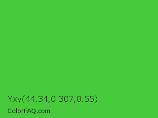 Yxy 44.34,0.307,0.55 Color is a normal green color and the nearest color is Lime Green #32cd32. Hex code #47cb3c and RGB value is rgb(71,203,60). In RGB color space, this color is composed of 28% red, 80% green, 24% blue, In CMYK color space, this color is composed of 65% cyan, 0% magenta, 70% yellow , 20% black , In HSL color space, this color has a hue angle of 115° , 58% saturation and 52% lightness.