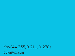 Yxy 44.355,0.211,0.278 Color is a normal cyan color and the nearest color is Cyan Process #00b7eb. Hex code #09c2e6 and RGB value is rgb(9,194,230). In RGB color space, this color is composed of 4% red, 76% green, 90% blue, In CMYK color space, this color is composed of 96% cyan, 16% magenta, 0% yellow , 10% black , In HSL color space, this color has a hue angle of 190° , 92% saturation and 47% lightness.