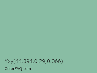 Yxy 44.394,0.29,0.366 Color is a light green color and the nearest color is Summer Green #96bbab. Hex code #89bda4 and RGB value is rgb(137,189,164). In RGB color space, this color is composed of 54% red, 74% green, 64% blue, In CMYK color space, this color is composed of 28% cyan, 0% magenta, 13% yellow , 26% black , In HSL color space, this color has a hue angle of 151° , 28% saturation and 64% lightness.