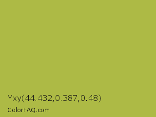Yxy 44.432,0.387,0.48 Color is a normal yellow color and the nearest color is Android Green #a4c639. Hex code #adba45 and RGB value is rgb(173,186,69). In RGB color space, this color is composed of 68% red, 73% green, 27% blue, In CMYK color space, this color is composed of 7% cyan, 0% magenta, 63% yellow , 27% black , In HSL color space, this color has a hue angle of 67° , 46% saturation and 50% lightness.