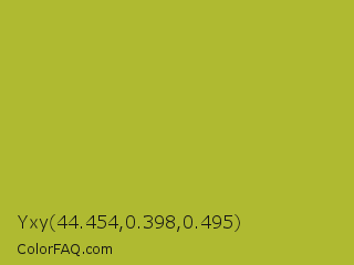 Yxy 44.454,0.398,0.495 Color is a normal yellow color and the nearest color is Android Green #a4c639. Hex code #afba31 and RGB value is rgb(175,186,49). In RGB color space, this color is composed of 69% red, 73% green, 19% blue, In CMYK color space, this color is composed of 6% cyan, 0% magenta, 74% yellow , 27% black , In HSL color space, this color has a hue angle of 65° , 58% saturation and 46% lightness.