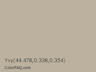 Yxy 44.478,0.338,0.354 Color is a light orange color and the nearest color is Malta #bdb2a1. Hex code #bbb19e and RGB value is rgb(187,177,158). In RGB color space, this color is composed of 73% red, 69% green, 62% blue, In CMYK color space, this color is composed of 0% cyan, 5% magenta, 16% yellow , 27% black , In HSL color space, this color has a hue angle of 39° , 18% saturation and 68% lightness.