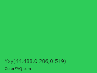 Yxy 44.488,0.286,0.519 Color is a normal green color and the nearest color is UFO Green #3cd070. Hex code #2ecc59 and RGB value is rgb(46,204,89). In RGB color space, this color is composed of 18% red, 80% green, 35% blue, In CMYK color space, this color is composed of 77% cyan, 0% magenta, 56% yellow , 20% black , In HSL color space, this color has a hue angle of 136° , 63% saturation and 49% lightness.