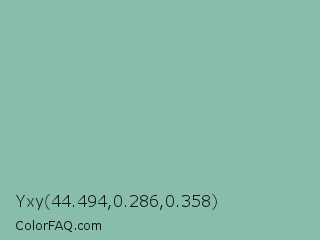Yxy 44.494,0.286,0.358 Color is a light green color and the nearest color is Gulf Stream #80b3ae. Hex code #88bda9 and RGB value is rgb(136,189,169). In RGB color space, this color is composed of 53% red, 74% green, 66% blue, In CMYK color space, this color is composed of 28% cyan, 0% magenta, 11% yellow , 26% black , In HSL color space, this color has a hue angle of 157° , 29% saturation and 64% lightness.