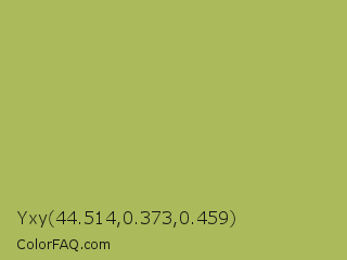 Yxy 44.514,0.373,0.459 Color is a normal yellow color and the nearest color is Middle Green Yellow #acbf60. Hex code #abba5a and RGB value is rgb(171,186,90). In RGB color space, this color is composed of 67% red, 73% green, 35% blue, In CMYK color space, this color is composed of 8% cyan, 0% magenta, 52% yellow , 27% black , In HSL color space, this color has a hue angle of 69° , 41% saturation and 54% lightness.