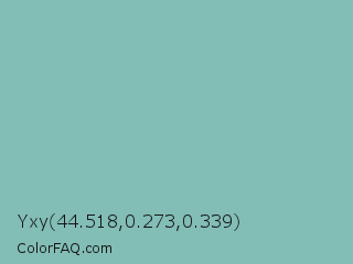 Yxy 44.518,0.273,0.339 Color is a light cyan color and the nearest color is Neptune #7cb7bb. Hex code #82bdb6 and RGB value is rgb(130,189,182). In RGB color space, this color is composed of 51% red, 74% green, 71% blue, In CMYK color space, this color is composed of 31% cyan, 0% magenta, 4% yellow , 26% black , In HSL color space, this color has a hue angle of 173° , 31% saturation and 63% lightness.