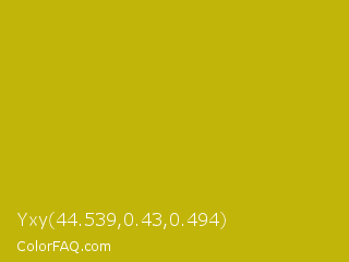 Yxy 44.539,0.43,0.494 Color is a normal yellow color and the nearest color is La Rioja #b3c110. Hex code #c2b50a and RGB value is rgb(194,181,10). In RGB color space, this color is composed of 76% red, 71% green, 4% blue, In CMYK color space, this color is composed of 0% cyan, 7% magenta, 95% yellow , 24% black , In HSL color space, this color has a hue angle of 56° , 90% saturation and 40% lightness.