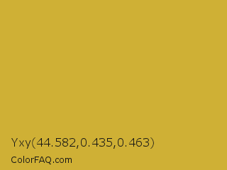 Yxy 44.582,0.435,0.463 Color is a normal yellow color and the nearest color is Gold Metallic #d4af37. Hex code #cfb035 and RGB value is rgb(207,176,53). In RGB color space, this color is composed of 81% red, 69% green, 21% blue, In CMYK color space, this color is composed of 0% cyan, 15% magenta, 74% yellow , 19% black , In HSL color space, this color has a hue angle of 48° , 62% saturation and 51% lightness.