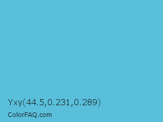 Yxy 44.5,0.231,0.289 Color is a normal cyan color and the nearest color is Viking #64ccdb. Hex code #59bfdb and RGB value is rgb(89,191,219). In RGB color space, this color is composed of 35% red, 75% green, 86% blue, In CMYK color space, this color is composed of 59% cyan, 13% magenta, 0% yellow , 14% black , In HSL color space, this color has a hue angle of 193° , 64% saturation and 60% lightness.