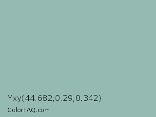 Yxy 44.682,0.29,0.342 Color is a light cyan color and the nearest color is Summer Green #96bbab. Hex code #95bab1 and RGB value is rgb(149,186,177). In RGB color space, this color is composed of 58% red, 73% green, 69% blue, In CMYK color space, this color is composed of 20% cyan, 0% magenta, 5% yellow , 27% black , In HSL color space, this color has a hue angle of 165° , 21% saturation and 66% lightness.