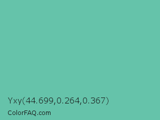 Yxy 44.699,0.264,0.367 Color is a normal cyan color and the nearest color is Tradewind #5fb3ac. Hex code #65c3aa and RGB value is rgb(101,195,170). In RGB color space, this color is composed of 40% red, 76% green, 67% blue, In CMYK color space, this color is composed of 48% cyan, 0% magenta, 13% yellow , 24% black , In HSL color space, this color has a hue angle of 164° , 44% saturation and 58% lightness.