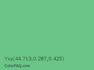 Yxy 44.713,0.287,0.425 Color is a normal green color and the nearest color is De York #7ac488. Hex code #69c588 and RGB value is rgb(105,197,136). In RGB color space, this color is composed of 41% red, 77% green, 53% blue, In CMYK color space, this color is composed of 47% cyan, 0% magenta, 31% yellow , 23% black , In HSL color space, this color has a hue angle of 140° , 44% saturation and 59% lightness.