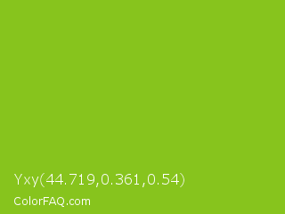 Yxy 44.719,0.361,0.54 Color is a normal green color and the nearest color is Lima #76bd17. Hex code #87c41d and RGB value is rgb(135,196,29). In RGB color space, this color is composed of 53% red, 77% green, 11% blue, In CMYK color space, this color is composed of 31% cyan, 0% magenta, 85% yellow , 23% black , In HSL color space, this color has a hue angle of 82° , 74% saturation and 44% lightness.