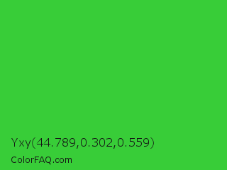 Yxy 44.789,0.302,0.559 Color is a normal green color and the nearest color is Lime Green #32cd32. Hex code #38cd38 and RGB value is rgb(56,205,56). In RGB color space, this color is composed of 22% red, 80% green, 22% blue, In CMYK color space, this color is composed of 73% cyan, 0% magenta, 73% yellow , 20% black , In HSL color space, this color has a hue angle of 120° , 60% saturation and 51% lightness.