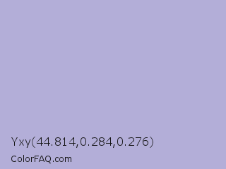 Yxy 44.814,0.284,0.276 Color is a light indigo color and the nearest color is Logan #aaa9cd. Hex code #b3aed8 and RGB value is rgb(179,174,216). In RGB color space, this color is composed of 70% red, 68% green, 85% blue, In CMYK color space, this color is composed of 17% cyan, 19% magenta, 0% yellow , 15% black , In HSL color space, this color has a hue angle of 247° , 35% saturation and 76% lightness.