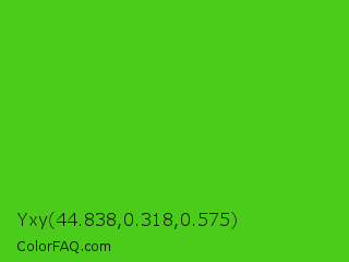 Yxy 44.838,0.318,0.575 Color is a normal green color and the nearest color is Harlequin Green #46cb18. Hex code #4ccc1a and RGB value is rgb(76,204,26). In RGB color space, this color is composed of 30% red, 80% green, 10% blue, In CMYK color space, this color is composed of 63% cyan, 0% magenta, 87% yellow , 20% black , In HSL color space, this color has a hue angle of 103° , 77% saturation and 45% lightness.