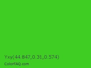 Yxy 44.847,0.31,0.574 Color is a normal green color and the nearest color is Harlequin Green #46cb18. Hex code #3fcd24 and RGB value is rgb(63,205,36). In RGB color space, this color is composed of 25% red, 80% green, 14% blue, In CMYK color space, this color is composed of 69% cyan, 0% magenta, 82% yellow , 20% black , In HSL color space, this color has a hue angle of 110° , 70% saturation and 47% lightness.