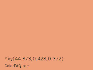 Yxy 44.873,0.428,0.372 Color is a light orange color and the nearest color is Dark Salmon #e9967a. Hex code #efa079 and RGB value is rgb(239,160,121). In RGB color space, this color is composed of 94% red, 63% green, 47% blue, In CMYK color space, this color is composed of 0% cyan, 33% magenta, 49% yellow , 6% black , In HSL color space, this color has a hue angle of 20° , 79% saturation and 71% lightness.