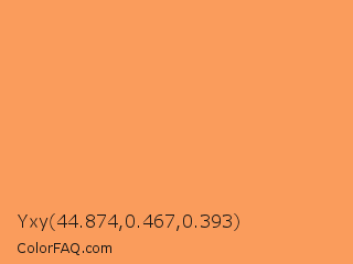Yxy 44.874,0.467,0.393 Color is a light orange color and the nearest color is Tan Hide #fa9d5a. Hex code #fa9c5c and RGB value is rgb(250,156,92). In RGB color space, this color is composed of 98% red, 61% green, 36% blue, In CMYK color space, this color is composed of 0% cyan, 38% magenta, 63% yellow , 2% black , In HSL color space, this color has a hue angle of 24° , 94% saturation and 67% lightness.