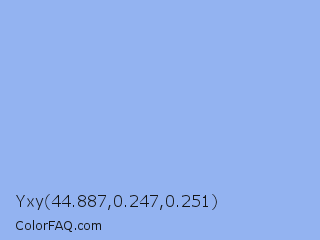 Yxy 44.887,0.247,0.251 Color is a light blue color and the nearest color is Jordy Blue #8ab9f1. Hex code #93b3f1 and RGB value is rgb(147,179,241). In RGB color space, this color is composed of 58% red, 70% green, 95% blue, In CMYK color space, this color is composed of 39% cyan, 26% magenta, 0% yellow , 5% black , In HSL color space, this color has a hue angle of 220° , 77% saturation and 76% lightness.